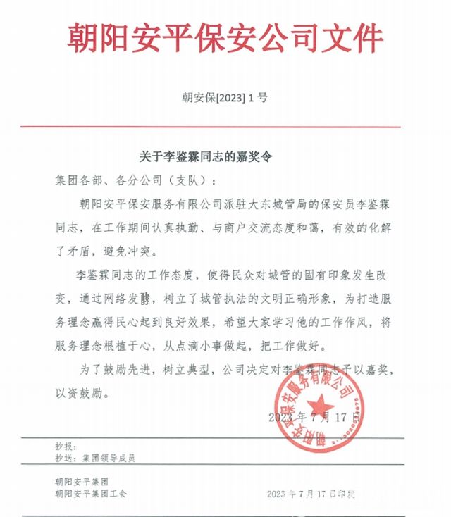 李鑒霖對于自己突然“火”了表示很意外,作為安平集團駐沈陽市大東區(qū)城市管理綜合執(zhí)法局工作人員,在隊長劉興鎖的帶領(lǐng)下,同事們都是嚴格按照公司章程和工作制度值勤,一言一行樹形象,一舉一動見文明。他表示,將不負安平集團栽培和社會各界的認可,今后會以更高的標準要求自己,時刻謹記集團“明道興德·恩澤社會”的企業(yè)宗旨,弘揚集團的服務(wù)理念,為集團健康發(fā)展、社會文明和諧貢獻力量。