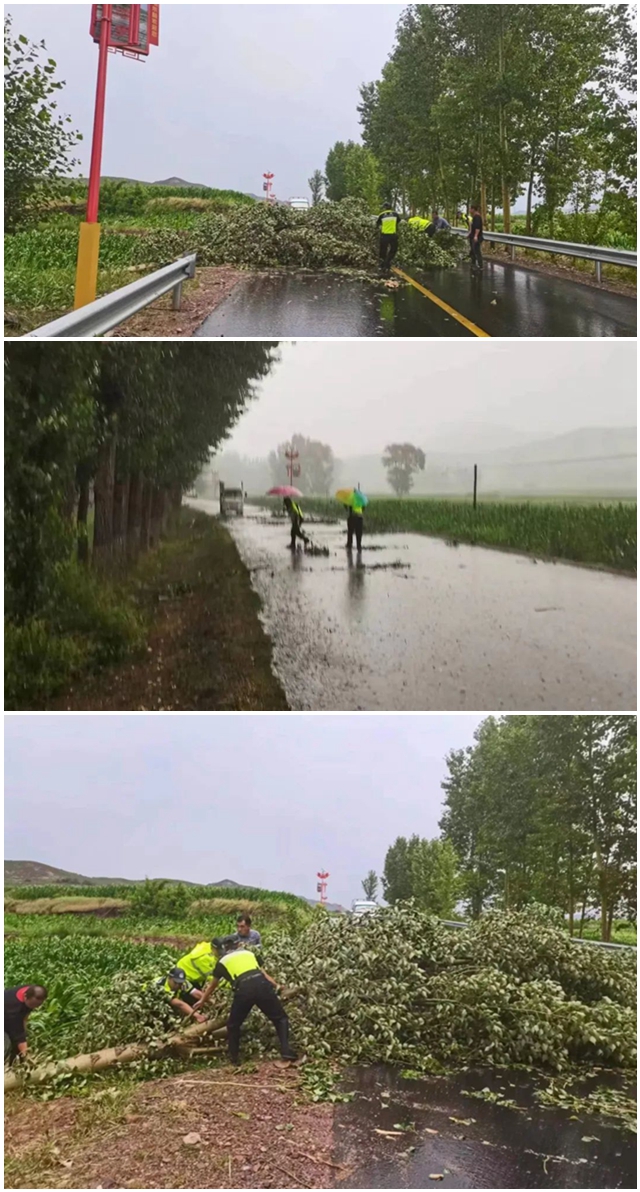 7月7日下午15時許,交警大隊大黑山中隊巡邏至桃萊線21公里處時,發(fā)現(xiàn)路邊一棵大樹被大風(fēng)刮折橫在路面,阻礙了車輛通行。為減少攔路樹木對出行的影響,避免交通事故發(fā)生,大黑山中隊巡邏隊員立即下車進(jìn)行清理,在過往群眾的幫助下,刮倒的樹木很快被大家齊心協(xié)力推至路邊,最終安全隱患得以消除,道路恢復(fù)正常。