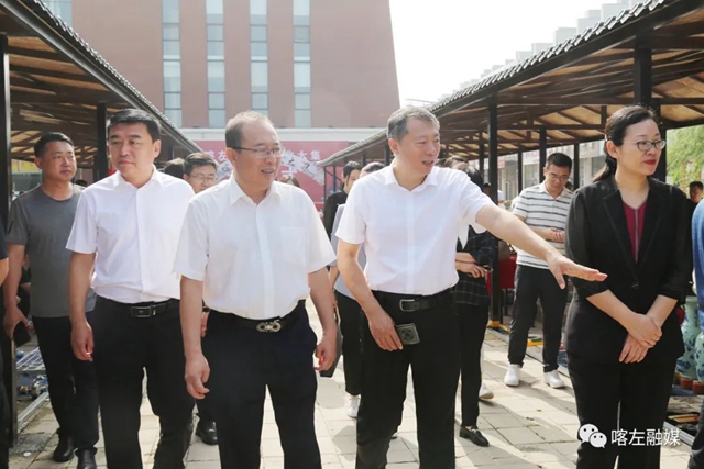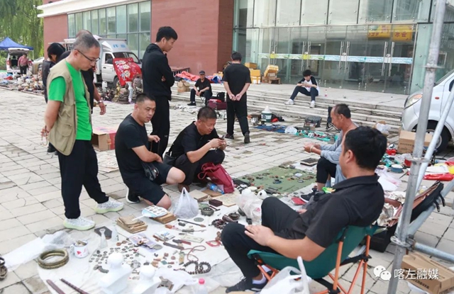 省文化和旅游廳黨組成員、副廳長趙輝(右一),市文旅廣電局局長王永輝(右二)、縣長張秀偉(前左二)等在古玩文化大集聽取情況介紹