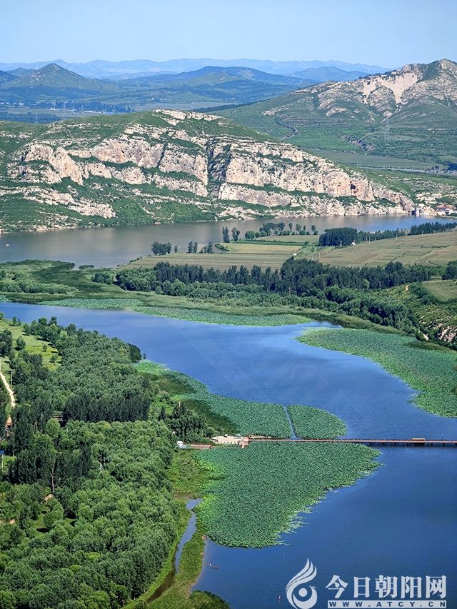悠悠碧水在長長深深的溝谷里靜靜流淌,潤澤著岸邊的村莊、鳥獸與草木。水鳥或林間小憩或空中盤旋,成為村莊和山河靈動美麗的裝飾。蓊郁的樹木像一條條長長的碧玉做成的玉帶點綴于山水間,有一處林帶,枝繁葉茂,密實得沒有一絲縫隙,頗像遮天蔽日的原始森林。蒹葭蒼蒼,在水一方,一叢叢的蘆葦,成為凌水不離不棄的親密而美麗的伙伴,一些水鳥生兒育女的溫馨家園。人工種植的百畝荷花更為壯麗,水綠的菏葉一大片、一大片地鋪在寬闊的河面,恰似凌河美麗的裙裾,倘若沿著人工鋪設(shè)、斗折蛇行的石基小路到河邊近觀,朵朵綻放的粉紅、嬌艷、雍榮的荷花點綴其間,微風(fēng)輕拂,荷花搖曳生姿,花香裊裊,簡直美到了極致。沿岸有兩個小小的村莊,其中一個正處于U形河灣底部的西岸,十幾戶人家沿河一字形排開,整齊劃一,這里青山擁抱、綠水環(huán)繞,鳥為友,花為伴,樹為傘,山為簾,水為鏡,生活在如此精美的山水長卷中,勞作之余,邀來三五好友,“開軒面場圃,把酒話桑麻”,這便是人們向往、追尋的歲月靜好、人間仙境吧!