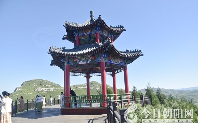 下車沿木棧道拾階而上,到達(dá)觀景臺。觀景臺的主體是一個古色古香的亭子,亭子造型別致,兩層灰色瓦檐上翹,猶如從遠(yuǎn)古飛來的兩只大鳥,在藍(lán)天展翅翱翔。亭里視野開闊,涼風(fēng)習(xí)習(xí),或立或坐,極目遠(yuǎn)眺,四周美景若凌河之水奔騰而來,紛紛撞入游人的眼簾。
