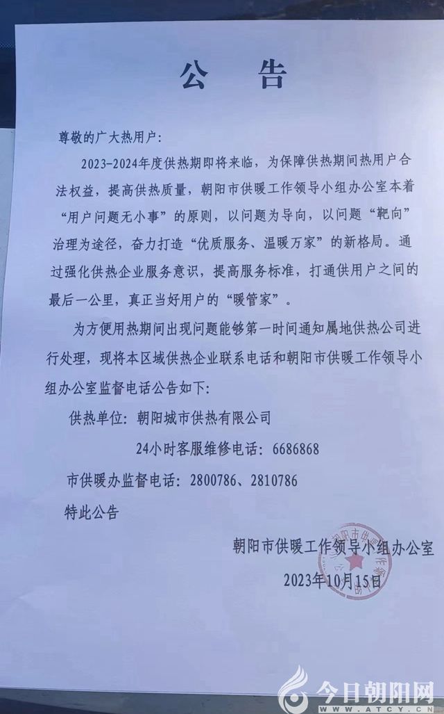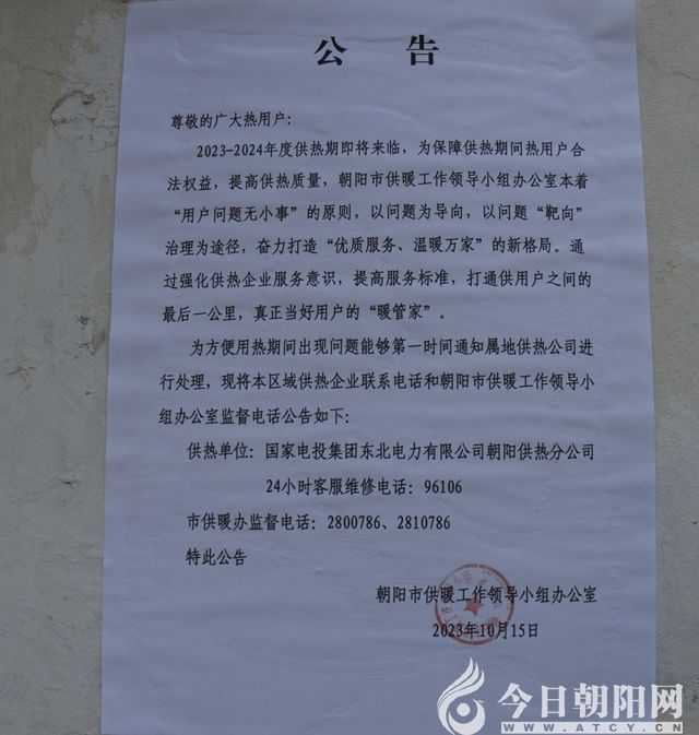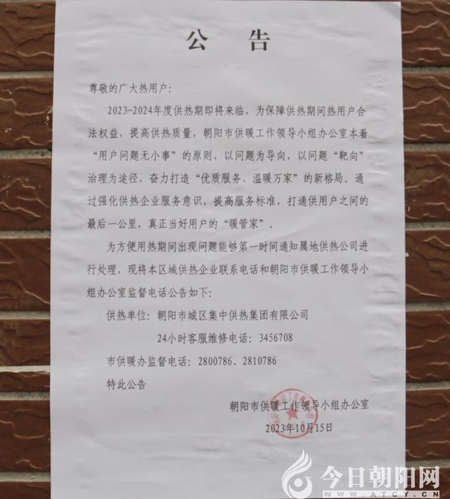 隨著供暖季的到來,遼寧省朝陽市委、市政府高度重視供暖工作,為暢通溝通渠道,及時回應(yīng)和解決人民群眾關(guān)于供暖的合理訴求,不斷提升人民群眾的獲得感和滿意度,在朝陽市住建局的統(tǒng)籌安排下,市供暖工作服務(wù)中心(市供暖辦)與供熱企業(yè)、社區(qū)聯(lián)動,走進(jìn)各小區(qū)張貼公告,公布三家供熱企業(yè)24小時客服維修電話以及市供暖辦監(jiān)督電話。