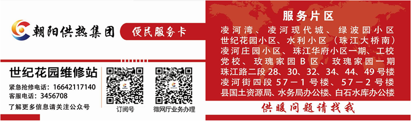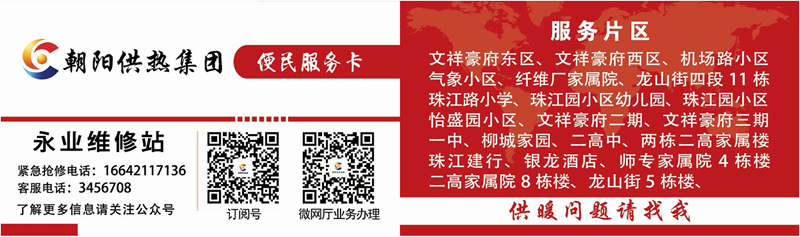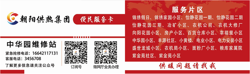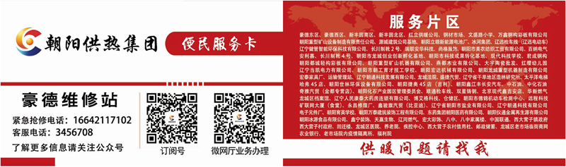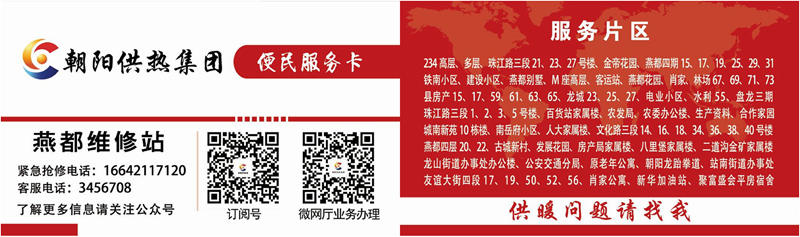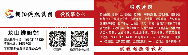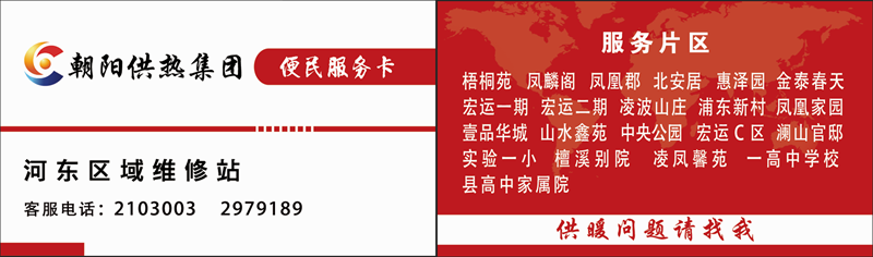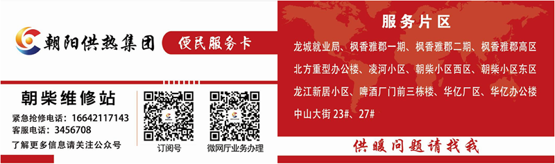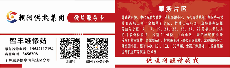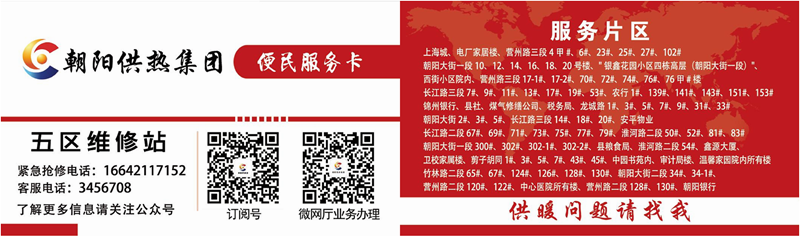 今冬供暖季即將到來(lái),為暢通群眾訴求渠道,及時(shí)解決群眾在供暖過(guò)程中遇到的問(wèn)題,在朝陽(yáng)市供暖工作服務(wù)中心的統(tǒng)籌安排下,朝陽(yáng)市城區(qū)集中供熱集團(tuán)有限公司印發(fā)了“供暖便民服務(wù)卡”,如市民朋友遇到供暖問(wèn)題,可及時(shí)撥打所在片區(qū)的維修電話,會(huì)有專(zhuān)人上門(mén)維修。