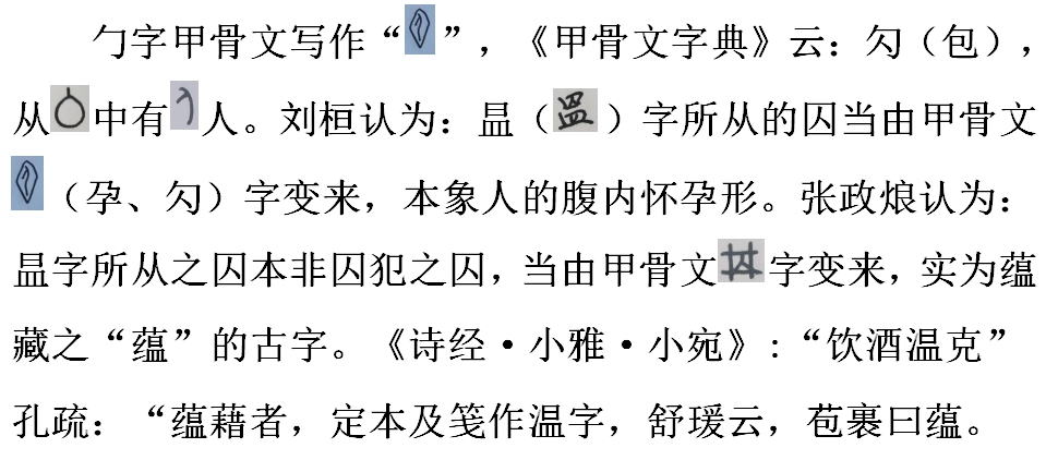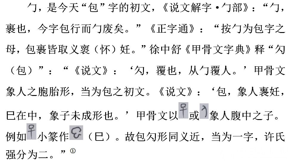 甲骨文身孕一字,《甲骨文字典》:從人而隆其腹,以示其有孕之形,本義當(dāng)為妊娠,或作腹內(nèi)有子形,則其義尤顯。孕婦之腹特大,故身亦可指腹,腹為人體主要部分,引申之人之全體亦可稱身,《說文》:“身,躳也,象人之身。”《易·艮》:“艮其身”虞注:“身,腹也?;蛑^妊娠也。”均是。②冢上之冖,即由孕之乃演化而來。