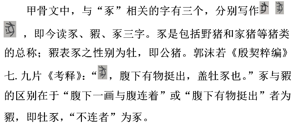 許慎《說文解字》釋“豖”:“豖,豕絆足行豖豖,從豕系二足,丑六切。”就是說,豕下一畫為系足之繩索,故釋豖為“系足之豕”。甲骨文出土后,解釋“豖”字者,聚訟甚多。一種觀點(diǎn)是承繼許慎之說。我國(guó)著名畜牧學(xué)家,教育家,中國(guó)現(xiàn)代養(yǎng)豬學(xué)奠基人之一的張仲葛,認(rèn)為豕下一畫為繩索等系囚之物。他說,據(jù)甲骨文記載,“當(dāng)時(shí)馴養(yǎng)野豬,必需用繩束等物系囚一時(shí),或加牿于其頭頸等以防其逃逸。如豕字甲骨文作‘豖’。豕字的‘、’(作者注:即豕下一筆)表明是用繩束或加牿的意思。”⑦另一種觀點(diǎn)是大家如郭沫若、楊樹達(dá)、聞一多、于省吾、徐中舒、唐蘭、孫海波、李孝定等都自有其說。聞一多先生認(rèn)為“今案(豕)腹下一畫與腹連著者為牡豕,則不連者殆即去勢(shì)之豕,因之,此字即當(dāng)釋為豖。”⑧;楊樹達(dá)先生《積微居小學(xué)述林》卷二《釋豖》:“余疑豖當(dāng)為豕去勢(shì)之義,今通語以為閹豬是也。”徐中舒《甲骨文字典》:“去勢(shì)之肥豕,用于祭祀。”聞、楊、徐等前輩均釋豖為“去勢(shì)之豕”,從而徹底否定了許慎的釋義。此觀點(diǎn)一出,立刻得到了學(xué)界的普遍認(rèn)可。