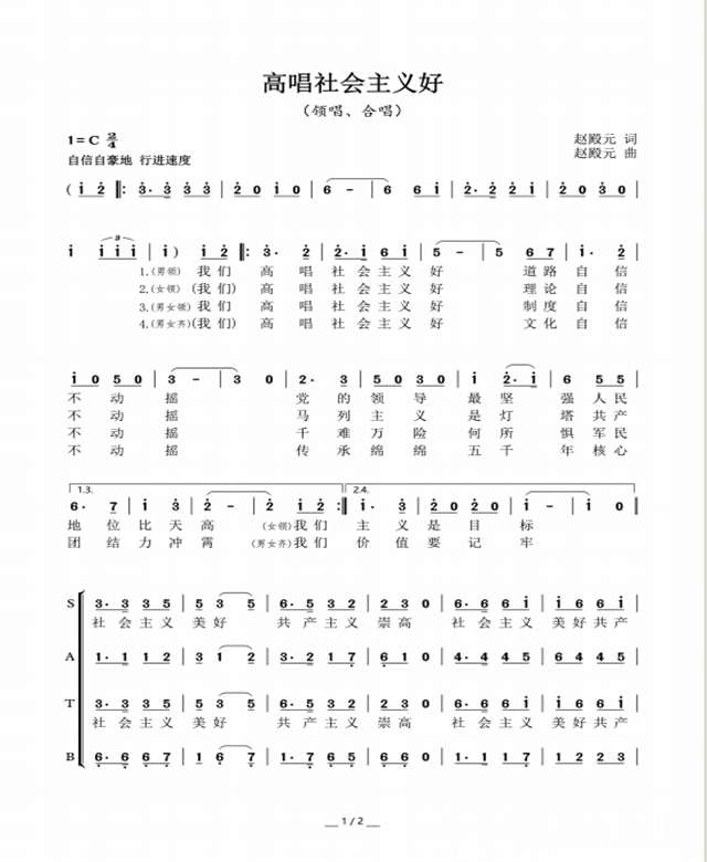 摘要:今年是中華人民共和國成立74周年。在國慶節(jié)即將到來之際,中共黨員、朝陽市音樂家協(xié)會(huì)主席趙殿元?jiǎng)?chuàng)作了歌曲《高唱社會(huì)主義好》,以浩然正氣、優(yōu)美旋律和熾熱情感,向祖國母親獻(xiàn)上了至純至真的節(jié)日祝福?,F(xiàn)本網(wǎng)予以重磅推送,以饗廣大網(wǎng)友,期望能共同傳唱,獻(xiàn)禮祖國!