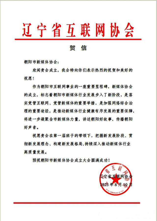 遼寧省互聯(lián)網(wǎng)協(xié)會向新成立的朝陽市新媒體協(xié)會發(fā)來賀信