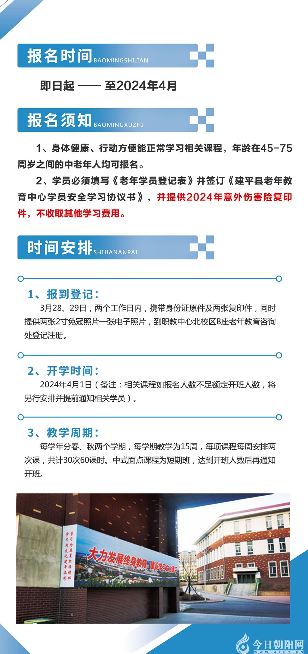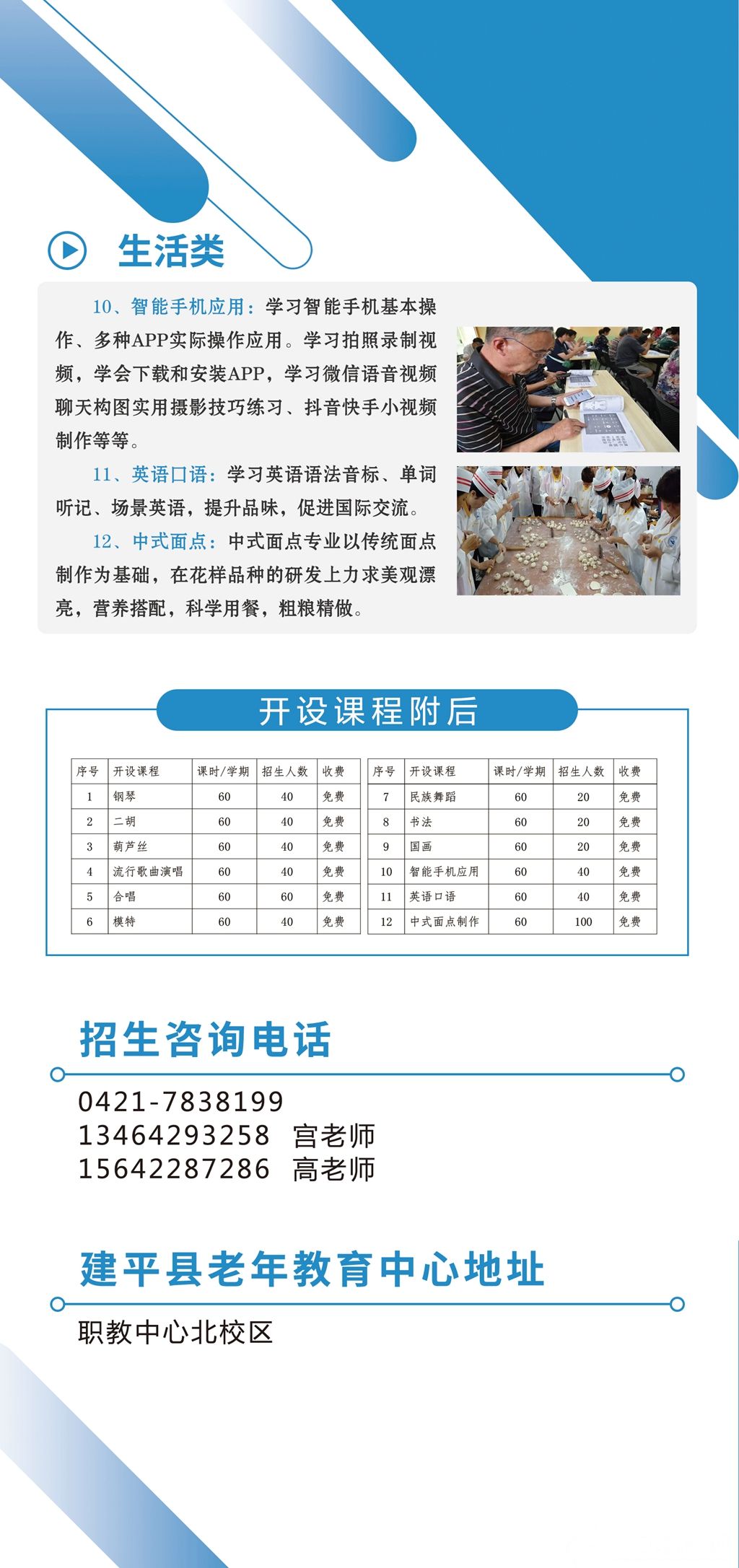 摘要:建平縣老年教育中心開(kāi)始招生啦,抓緊報(bào)名吧! ?。ū疚膬?nèi)容由遼寧省建平縣職教中心督導(dǎo)室提供) [編輯 雅賢 編審 春語(yǔ)] 建平職教中心專屬園地 【本網(wǎng)聲明】