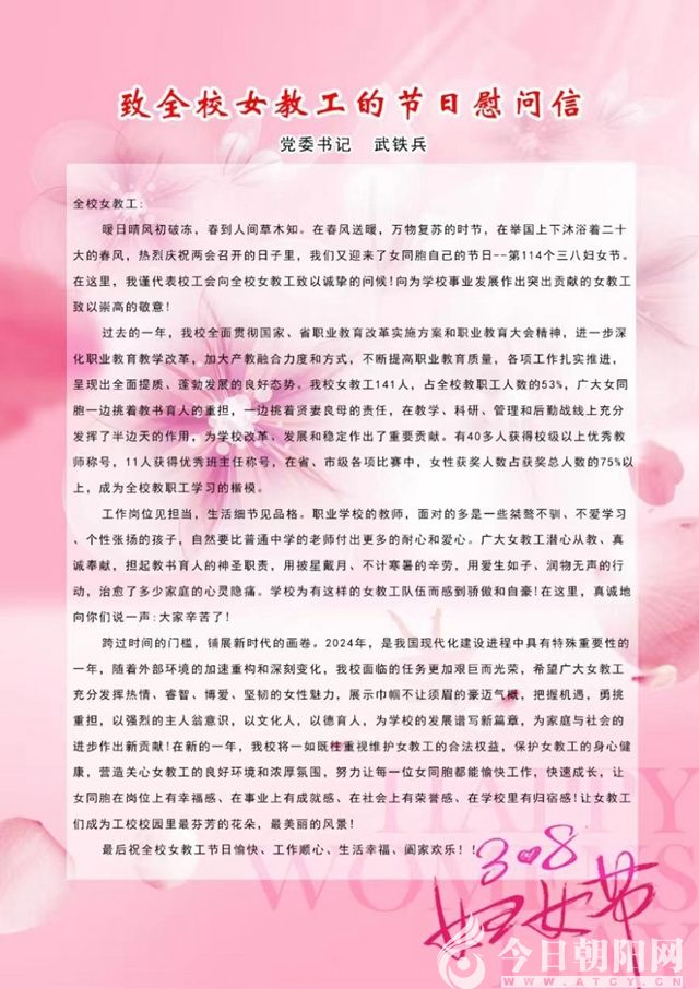 3月8日上午,武鐵兵代表學(xué)校領(lǐng)導(dǎo)班子發(fā)出了節(jié)日慰問信,向全校女職工致以誠摯的節(jié)日問候,向?yàn)閷W(xué)校教育事業(yè)發(fā)展作出杰出貢獻(xiàn)的女職工們致以崇高的敬意。他表示,2024年,是我國現(xiàn)代化建設(shè)進(jìn)程中具有特殊重要性的一年,隨著外部環(huán)境的加速重構(gòu)和深刻變化,學(xué)校面臨的任務(wù)更加艱巨而光榮,希望廣大女教工繼續(xù)以巾幗不讓須眉的豪邁氣概,以文化人,以德育人,為學(xué)校發(fā)展譜寫新篇章,為家庭與社會進(jìn)步作出新貢獻(xiàn)。