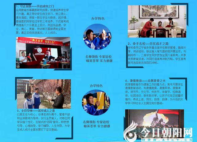 學(xué)校師資力量強(qiáng)大,使學(xué)生不出朝陽(yáng)就擁有媲美于大城市普通高中的優(yōu)質(zhì)教育資源。聘請(qǐng)遼寧省實(shí)驗(yàn)中學(xué)、朝陽(yáng)一、二高等學(xué)校遼寧名師為文化課各科首席教師,聘請(qǐng)省市教育專家、資深教研員組建顧問智囊及管理團(tuán)隊(duì)。他們不僅傳授知識(shí),更注重學(xué)生能力的培養(yǎng)和人格的塑造,為學(xué)生圓夢(mèng)大學(xué)保駕護(hù)航。
