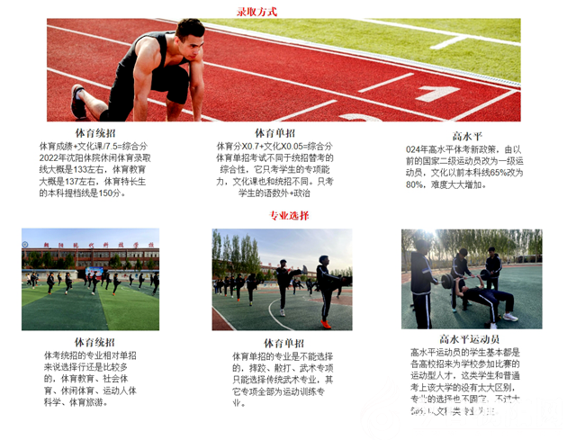該專業(yè)始終堅(jiān)持把立德樹人作為人才培養(yǎng)的中心工作,全力培養(yǎng)德智體美勞全面發(fā)展的優(yōu)秀人才。專業(yè)分為升學(xué)班和就業(yè)班。升學(xué)班以升學(xué)為主要目標(biāo),課程和高中部同步,學(xué)習(xí)、選科以及參加學(xué)業(yè)水平測(cè)試為高考做準(zhǔn)備,每天6點(diǎn)到7點(diǎn)30分,第七、八節(jié)課為體育生訓(xùn)練時(shí)間,其他時(shí)間均為學(xué)習(xí)文化課時(shí)間。畢業(yè)可通過體考統(tǒng)招、體考單招、高水平運(yùn)動(dòng)員等多種升學(xué)途徑上大學(xué),相對(duì)普通高考難度要低很多,文化課150分即可報(bào)本科類院校。大學(xué)畢業(yè)就業(yè)途徑廣泛,可以擔(dān)任各級(jí)各類學(xué)校的體育教師,還能夠勝任中考體育指導(dǎo)師、青少年體適能訓(xùn)練師等崗位。也可以選擇從事各級(jí)各類體育專業(yè)學(xué)校的運(yùn)動(dòng)隊(duì)教練,到體制內(nèi)的體育管理部門工作,到俱樂部做技能指導(dǎo),如籃球俱樂部教練員等。另外,還可以考取裁判等級(jí)證書,在教育局備檔后參加各類賽事的組織與裁判工作。