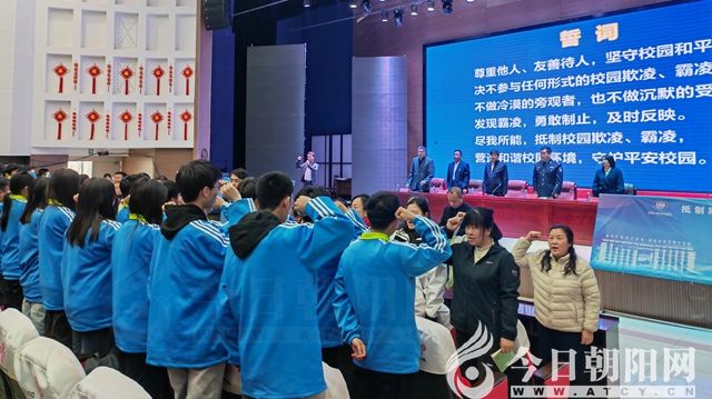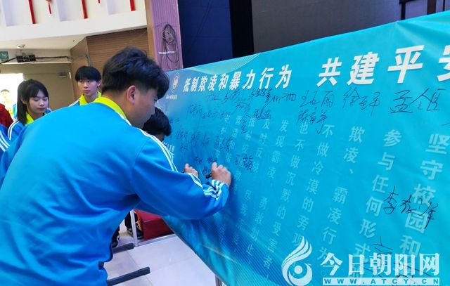 會(huì)議最后,全體師生舉行“防止校園欺凌,共建和諧校園”主題宣誓活動(dòng)并在簽字墻上落筆簽名。