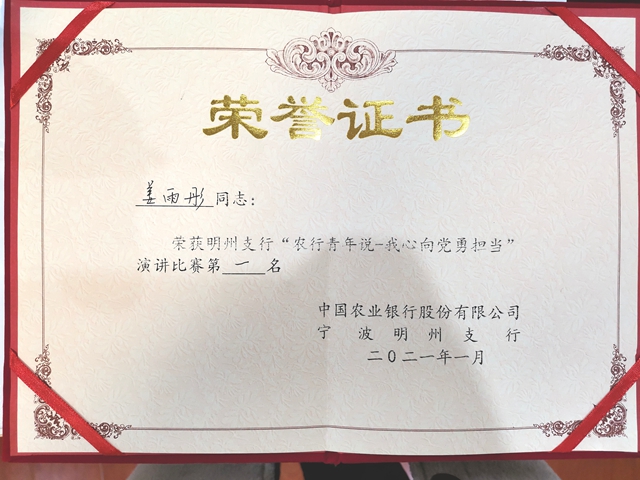 2019年大學(xué)畢業(yè)后,她進(jìn)入了中國(guó)農(nóng)業(yè)銀行寧波明州支行工作。走上工作崗位的她,牢記老師對(duì)她的教導(dǎo),認(rèn)真對(duì)待每一項(xiàng)工作,踏踏實(shí)實(shí)、勤勤懇懇。擔(dān)任鄞江支行柜面經(jīng)理期間,她除了完成本職工作外,還利用業(yè)余時(shí)間撰寫(xiě)多篇企業(yè)內(nèi)刊文章,并為自己與所在單位拿到通訊員、單位考核完成率第一名的好成績(jī),她的研討文章《淺談改進(jìn)農(nóng)行掌銀》被《寧波農(nóng)村金融》采用。擔(dān)任國(guó)業(yè)部外匯會(huì)計(jì)期間,她認(rèn)真學(xué)習(xí)外匯業(yè)務(wù)的同時(shí)競(jìng)聘了明州支行第二屆團(tuán)委委員,成功入選宣傳委員,輔助團(tuán)委書(shū)記及綜合部做好團(tuán)委相關(guān)工作。擔(dān)任綜合管理部文秘期間,她的多篇文章被寧波市分行“青穗園”、分行內(nèi)網(wǎng)、外部媒體選用,并獲得寧波市分行優(yōu)秀小編稱號(hào)。協(xié)助工會(huì)進(jìn)行行業(yè)管理,承擔(dān)女工委責(zé)任,做好全行活動(dòng)組織、策劃、編輯等工作,獲得寧波市分行工會(huì)積極分子榮譽(yù)稱號(hào)。2024年4月,她由綜合管理部綜合文秘調(diào)至個(gè)人金融部產(chǎn)品經(jīng)理一職,面對(duì)新興業(yè)務(wù)她毫不退縮,較好地完成了各項(xiàng)目標(biāo)任務(wù)。