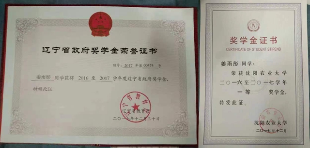 2015年,她如愿考入沈陽(yáng)農(nóng)業(yè)大學(xué)生物工程專業(yè),圓了大學(xué)夢(mèng)。接到錄取通知書(shū)的那一刻,她欣喜若狂,喜極而泣,三年的付出終于等到了大學(xué)伸來(lái)的橄欖枝。大學(xué)期間,她一刻也沒(méi)有放松,學(xué)習(xí)方面更加刻苦。由于大學(xué)期間成績(jī)優(yōu)異,曾榮獲遼寧省政府獎(jiǎng)學(xué)金一次,校級(jí)一等獎(jiǎng)學(xué)金三次、二等獎(jiǎng)學(xué)金一次。她還積極參加學(xué)校組織的各項(xiàng)活動(dòng),由于出色表現(xiàn),在生物學(xué)院辯論賽中取得第三名的好成績(jī),那個(gè)不善言辭,不愛(ài)表達(dá)的女孩在不斷的自我挑戰(zhàn)中茁壯成長(zhǎng)。