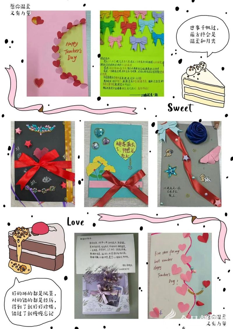 活動(dòng)通知一經(jīng)發(fā)出,得到了廣大師生的熱烈響應(yīng),共收到204件作品,其中賀卡136張、攝影作品68張。學(xué)生們通過(guò)制作手工賀卡和拍攝合影作品的方式,向辛勤付出的老師獻(xiàn)上美好的祝福,表達(dá)真摯的感恩之情。這些賀卡和照片不僅是珍貴的回憶,更是師生之間深厚感情的見(jiàn)證。