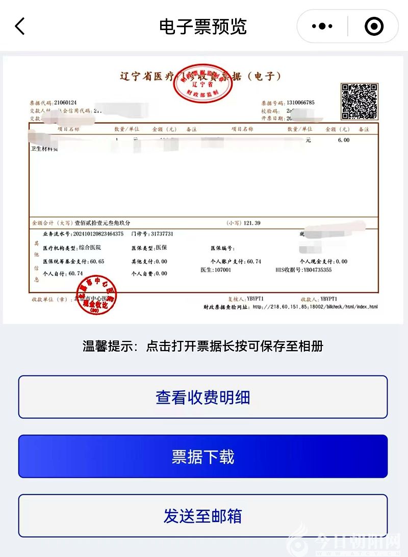 一鍵獲取、避免丟失。遼寧省北票市中心醫(yī)院推出“無紙化”電子票據(jù)惠民服務(wù),門診醫(yī)療收費電子票據(jù)11月1日全面上線。推出電子票據(jù),可以減少現(xiàn)場排隊取票時間,避免紙質(zhì)票據(jù)損壞、丟失等風險,讓就診更加便利。