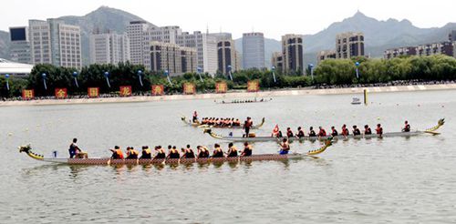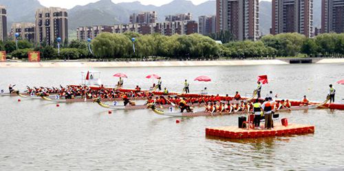 往日比較寂靜、幽雅的景區(qū),一下涌來了這么多人,許多維護秩序的民警和身著大賽標(biāo)志的服務(wù)人員,在按部就班地進行指揮疏導(dǎo)。人工湖中布置浮標(biāo)的快艇,往來穿梭,也在為即將到來的龍舟大賽做著最后的準(zhǔn)備。