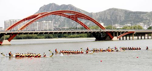 我大約在湖畔看似無目的閑逛四個多小時,其實是不斷地捕捉亮點趣事。直至中午十一點三十分,龍舟大賽200米預(yù)賽才正式開始。只聽一聲清脆的發(fā)令槍響過后,現(xiàn)場氣氛頓時被各參賽隊喧天的鼓聲激發(fā)出來。瞬間,凌水兩岸,虹橋上,舟楫中,歡呼聲、吶喊聲交織在一起,響成一片。只見數(shù)舟競發(fā),木櫓輕搖,船槳上下翻飛。一艘艘奮進龍舟的后面,泛起一朵朵漂亮的水花兒,只見艘艘龍舟若蛟龍出水,又如離弦之箭,疾速向終點沖刺。雖然只有短暫的幾分鐘,卻傾情演繹出這速度與激情。凌水兩岸,頓成歡呼的海洋。