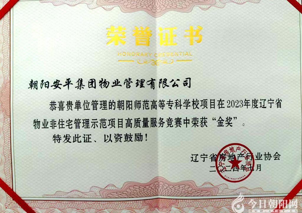 大會還向在2023年度遼寧省物業(yè)服務(wù)項(xiàng)目高質(zhì)量發(fā)展競技大賽中的獲獎單位頒獎。其中,安平物業(yè)榮獲2023年度遼寧省物業(yè)企業(yè)履行社會責(zé)任競賽“金獎”;安平物業(yè)管理的朝陽師范高等專科學(xué)校項(xiàng)目在2023年度遼寧省物業(yè)非住宅管理示范項(xiàng)目高質(zhì)量服務(wù)競賽中榮獲“金獎”。安平物業(yè)參會代表表示,“金獎”是大家愛崗敬業(yè)、齊心協(xié)力取得的榮譽(yù),這也激勵我們在今后的工作中始終堅(jiān)持用心服務(wù),不斷開拓進(jìn)取,持續(xù)提高業(yè)務(wù)水平和服務(wù)質(zhì)量。