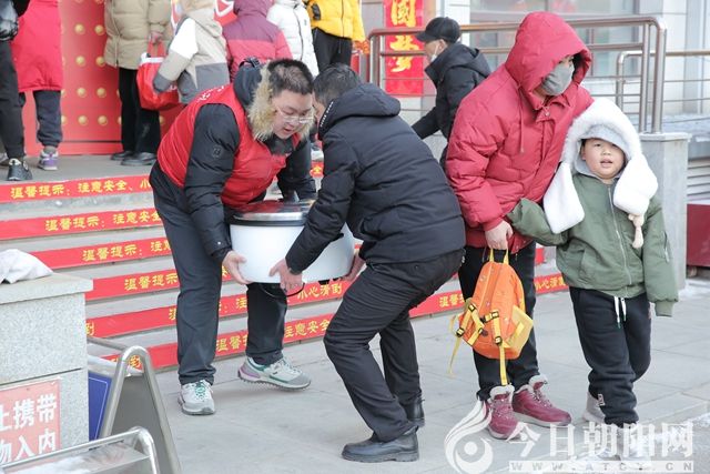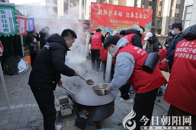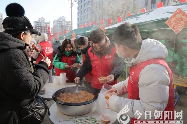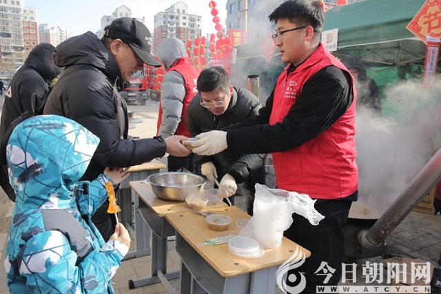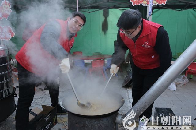 廣場(chǎng)上,呼出的白氣與食物熱騰騰的蒸氣交織在一起,志愿者在一片白茫茫里添柴、舀菜、裝盒、遞接,雙手凍得通紅,臉上卻笑容不減,時(shí)不時(shí)傳來(lái)一兩句吆喝聲,現(xiàn)場(chǎng)熱鬧非常,盡顯濃濃的節(jié)日氛圍。