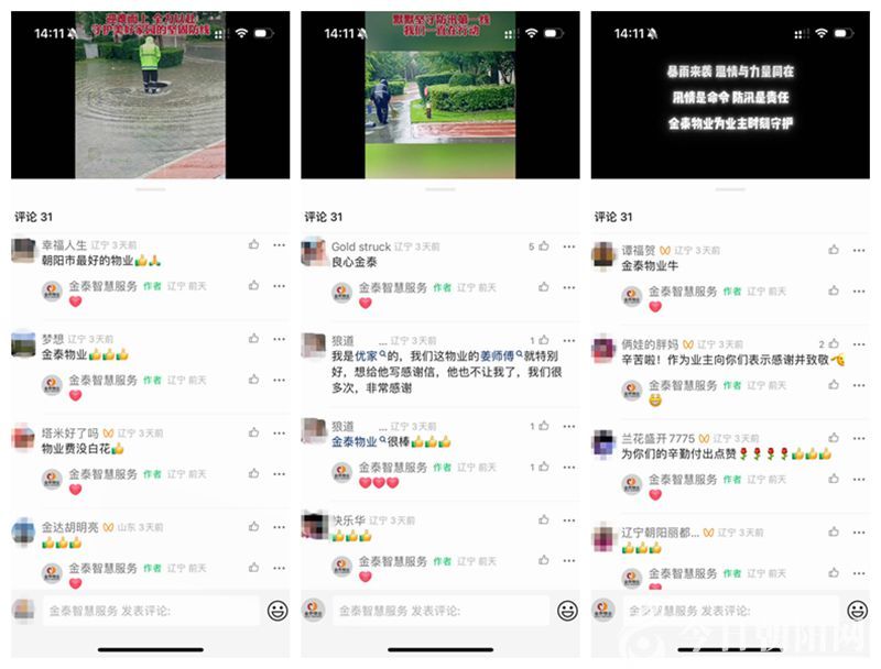 8月19日至20日,遼寧省朝陽(yáng)市遭遇強(qiáng)降雨。金泰物業(yè)各項(xiàng)目部以“汛”為令,立即啟動(dòng)防汛應(yīng)急預(yù)案,嚴(yán)格落實(shí)值班值守制度,抓實(shí)抓細(xì)各項(xiàng)防汛措施,并對(duì)重點(diǎn)點(diǎn)位進(jìn)行防御部署,全力應(yīng)對(duì)暴雨侵襲,用實(shí)際行動(dòng)保障廣大業(yè)主的生命財(cái)產(chǎn)安全。