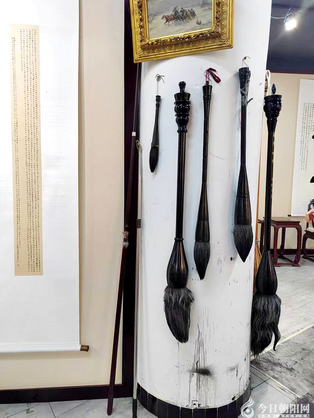 環(huán)顧這個(gè)充滿墨香的工作室,看著墻上懸掛的特大號(hào)毛筆和滿架的書(shū)帖,我仿佛看見(jiàn)了一個(gè)默默耕耘的身影,一位不僅以筆墨傳承文化,更以真心溫暖一方的書(shū)法帶頭人。