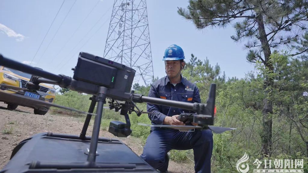 這位國網朝陽供電公司輸電工區(qū)的班長,已經在這條電力動脈上守護了十四年,翻山越嶺成了日常,皮卡車上的顛簸早已刻進了身體里。山風掠過他古銅色的面龐,目光如鷹隼般銳利,正調試著無人機遙控器,透過屏幕一寸寸檢閱著鐵塔的每一個螺栓、每一片絕緣子,任何細微的裂紋都逃不過他的眼睛。