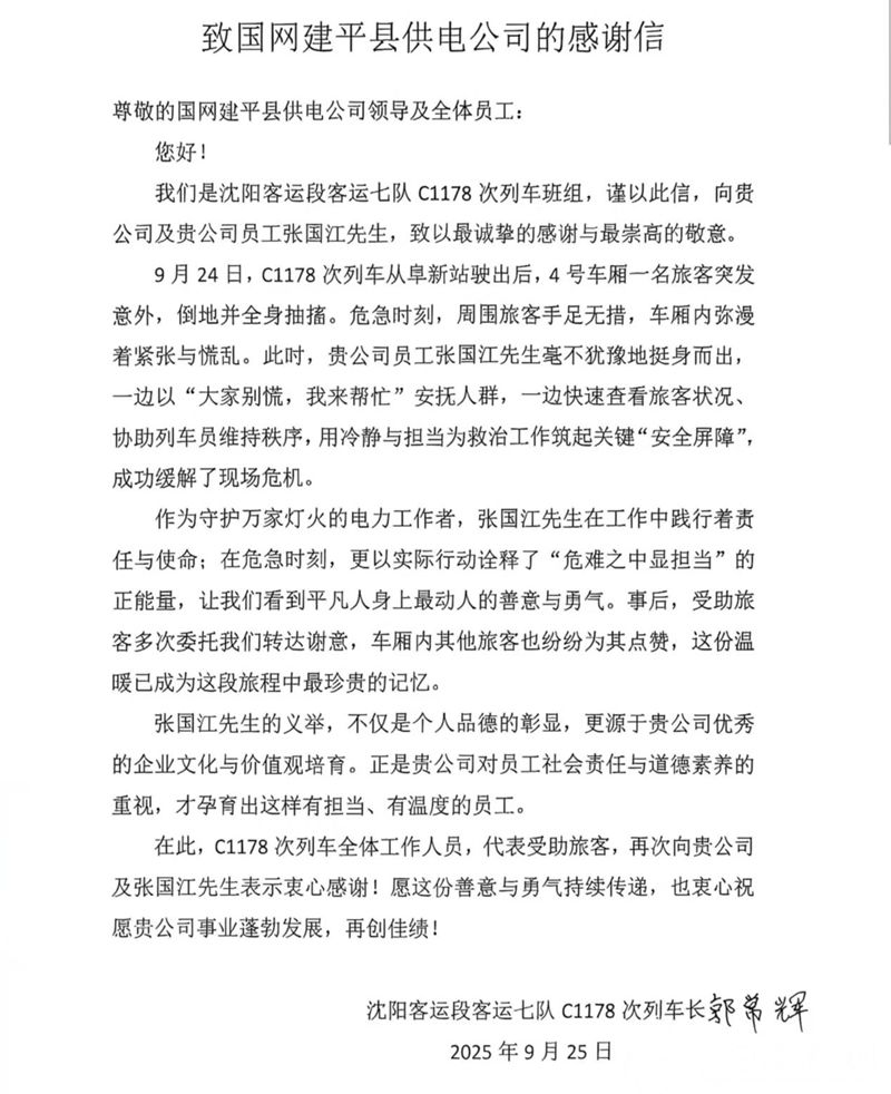 9月26日,國(guó)網(wǎng)朝陽(yáng)建平縣供電公司收到一封來(lái)自鐵路部門(mén)的感謝信,信中詳細(xì)講述了該公司職工張國(guó)江在高鐵上緊急救助突發(fā)疾病乘客的事跡,字里行間充滿了對(duì)這位老黨員臨危不亂、專(zhuān)業(yè)施救的敬意。這封特殊的來(lái)信,讓一次暖心的救援被更多人知曉,也展現(xiàn)了基層黨員在多次應(yīng)急救援培訓(xùn)中錘煉出的過(guò)硬本領(lǐng)。