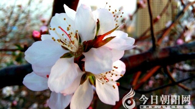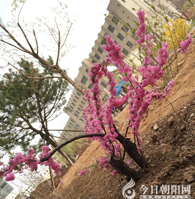 四下望去,目光忽然被樓下小花園里的桃樹吸住。不知何時,樹上的桃花竟然綻放得妖艷多姿,盡顯盎然春意,讓人無盡遐思。北方的冬季長,很難界定春季到來的時間,于是我們就看街邊的桃花,桃花放了,春季就到了,于是忙不迭地脫去厚重的冬裝,享受春的快感。在桃花的映襯下,街上的景致真的是美不勝收。