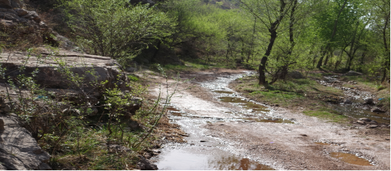如此走走停停,約莫小半個時辰過去,一道胳膊肘彎拐過,眼前的溝壑蔥郁的植被忽然斷檔,溪流再不見一縷,干枯的河床空空蕩蕩,突兀的巨石橫七豎八地布著陣,緊貼山腳的沙石路一覽無余。人疑是轉(zhuǎn)瞬間從景色旖旎的江南,穿越到大漠孤煙的塞北,荒蕪、寂寥的氣息一股腦涌來,讓人生成莫大的心理落差,新奇中夾了幾分神秘:前方該是怎樣的一處村莊呢?