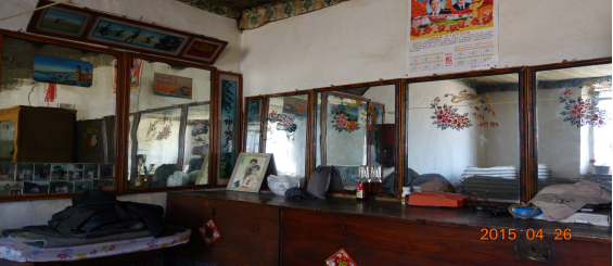 東山腳下,一戶六旬開外的苗姓村民家里,草料棚,牲畜圈,養(yǎng)著兩大一小長耳朵毛驢。院門一側(cè)拴著只小黃狗,兩只小眼睛黑葡萄似的,見有生人進(jìn)來便“汪、汪”撒著歡地咬。土房山墻脊泥巴裂開了縫隙,房頂壓了一層石棉瓦,檐下掛著鋤頭、耙子等農(nóng)具。屋里拾掇的利整,縫紉機(jī)、掛鐘這些老物件還在沿用著。擦得一塵不染的老式箱柜上,立著一排墻鏡,兩側(cè)條鏡草書毛體黑字對聯(lián),其中一副是:“春風(fēng)楊柳萬千條,六億神州盡舜堯。”鏡框顏色有些晦暗,邊緣夾著兩排孫男弟女照片。女主人介紹,兒女都在溝外大的地方打工生活,只在年節(jié)帶了孫子孫女們回來,平時偌大家里就剩老兩口,村里其他人家也大抵如此,最興旺時,村里有三十五戶人家三百四五十口,現(xiàn)在就剩下十多戶二三十口,而且都是五十歲以上的老人。主人說的平和,倒看不出心緒有幾多惆悵。傳統(tǒng)意義上的家園正在遭遇現(xiàn)代文明的誘惑和挑戰(zhàn),即便眼下有一批如苗氏老人們堅(jiān)如磐石的虔誠守望,又有誰敢保證不會有一天,承載我們精神和靈魂的棲息地將無處尋覓呢?!