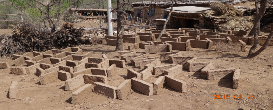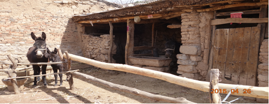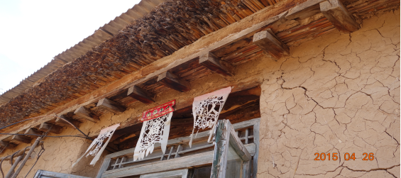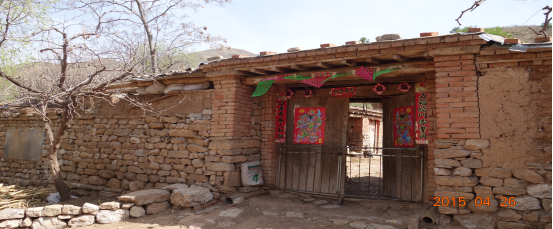 民居三三兩兩地散落在山腳下,多是上世紀(jì)六七十年代,北方農(nóng)村最普遍的那種老式平房,青石壘出半人高厚實(shí)的房基,也有的人家一石到頂,在山墻的四角和門窗口砌了磚垛,土坯碼起的墻圍掛了泥面,平展,擋風(fēng)。走近了仰觀,梁柱上鋪了厚厚的房笆,成束的秸桿從檐下探出個坡狀,斷面糟爛黑漆,早失去了往昔的色澤。一副副木制的板門、窗欞斑駁粗糙,架框有些許翹棱走形。這樣的建筑因陋就簡,原汁原味。時下,在方興未艾的新農(nóng)村建設(shè)中已然很難見到。