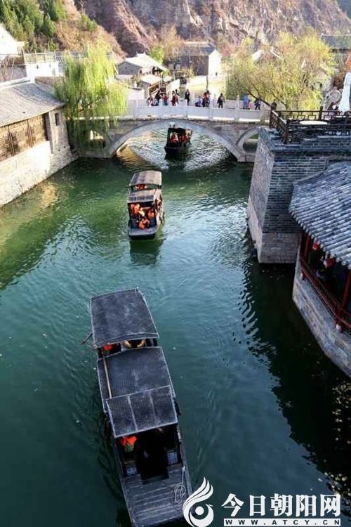 水鎮(zhèn)里那些小橋下、湖面上緩緩劃行的黑色小船,據(jù)說都是從烏鎮(zhèn)運輸過來的烏篷船。800年前的陸游說它是“輕舟八尺,低蓬三扇”,可謂江南水鄉(xiāng)的一道亮麗風景?,F(xiàn)在,古北水鎮(zhèn)小橋有了,流水有了,烏篷船也有了,在這里乘船游湖,水中賞景,不是江南勝似江南。作為北方人來說,想想都心生愜意。