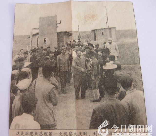 從紅海灘回來(lái),我們便來(lái)到了郭叔家。郭嬸從一個(gè)精致的盒子里把這張舊報(bào)紙取出來(lái)遞給郭叔,郭叔小心翼翼地展開(kāi)來(lái)。我們懷著崇敬的情懷看這珍貴的照片,畫(huà)面上是茫?;脑n蒼長(zhǎng)天,密麻麻的小草在勁風(fēng)中搖曳,那一定是頑強(qiáng)的堿蓬草了!井站前幾十位工人中間,周總理正親切地與一位員工握手,那工人身后是一個(gè)簡(jiǎn)單的小圓桌,桌上放著兩個(gè)茶杯。報(bào)紙已經(jīng)發(fā)黃,但周總理慈祥微笑的面容依然清晰。郭叔告訴我,周總理身后第三位就是他。面對(duì)與總理的合影,郭叔眼睛又濕潤(rùn)了,在場(chǎng)的人也感動(dòng)萬(wàn)分。我對(duì)郭叔說(shuō),能否讓我把這報(bào)紙上總理視察大慶看望員工時(shí)的這張合影拍照下來(lái)?郭叔欣然應(yīng)允。于是,我一連拍攝了好幾個(gè)鏡頭。