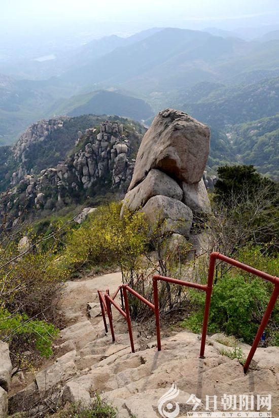 轉出山腰,將及山頂,但見幽林疏曠,巨石羅列,曲徑開鑿于累累巨石之上,陡然峭立起來。有的石頭,高高的盤踞在其它巨石上,驚險的探出身子,讓人擔心一陣風便能吹下來。于是一邊手腳并用,攀著鐵欄小心翼翼向上攀爬,一邊驚奇的看著四周的奇石異景,忍不住停下拍照。登上太平頂,抓著欄桿站在峭立千尺的崖壁之旁,盡情向四處眺望,徂徠的景色盡入目中。層疊的山嶺,或起或伏,向著遠處延伸;千姿百態(tài)的巨石,灑落在山巔和山間的各個角落,與蒼松幽林相映成趣。我突然想,石乃山之骨,山無骨不立,有高山必有巨石,有名山必有傲骨;土乃山之膚,山無土不茂,然后清泉幽林,得以環(huán)繞其間;涂抹如畫,一切生機盎然。我以為徂徠不似嶧山之奇崛,也不似蒙山之巍巍,站在山巔,我甚至覺不出徂徠的高與奇,因為眼前的景色,美如畫屏:幽林蒼蒼,密布遠山,巨石羅列,塊然其間,又有山花紅葉,星星點綴——恰成一副和諧的畫卷。