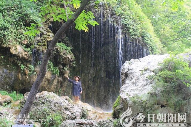 嗅著清香的山風(fēng),踏著秀美的山石,繼續(xù)前行。我在心里暗暗想,大自然咋這樣的神奇,這水為什么這樣的清澈,清澈的叫你心里沒有一點(diǎn)雜念,完全地陶醉在了整個山水畫廊里。水順著山峰往下流淌,我們逆水而行,聽著這叮咚的山泉,如歌聲,似天籟,陪著我們一路前行。忽聽嘩嘩作響聲,抬頭一看,竟有一簾瀑布從墨綠的山峰上傾瀉下來,這水簾,這水聲,難道這里就是傳說中的“水簾洞”嗎?簡直是太美了,我一定爬上去,當(dāng)一把齊天大圣。真的不好往上爬呀,濕漉漉的石頭很光很滑,看著不遠(yuǎn)的距離,每一步都是那樣的艱險??赡秋w流潺潺的水珠,就在眼前,真的想鉆進(jìn)那個水簾里。一步一驚,終于爬到了水簾下面,到了水流跟前,才覺得這飛瀑真的是氣勢宏偉、水流如注。顧不得水流澆在身上,我一頭沖進(jìn)了雨簾的后面。真的太神奇了,那水簾就在眼前從天而降,瀟瀟灑灑地傾瀉著。站在水簾里,看著對面俏麗的山巒,真的想走進(jìn)洞里從此居住下去。同行的朋友給我拍下了這珍貴的鏡頭,真是此生難忘的一刻。我與水簾洞,今生的緣分。