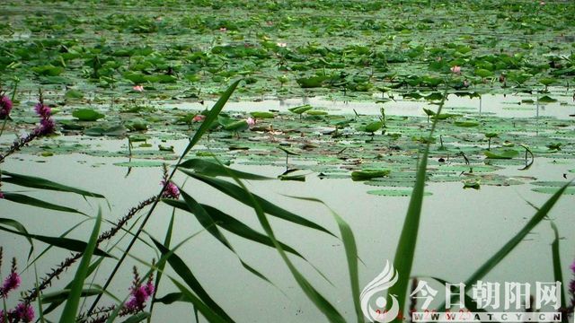 初夏,迷蒙細雨,把晶瑩的珍珠滾落在田田的荷葉上,大詩人蘇軾看到的是“珍珠零落難收拾”,應(yīng)該是風較大時。我看到的是“雨灑珍珠破又圓”,是微風時。荷葉挺出水,荷花箭在“婷婷的舞女的裙”中間鉆出來,“小荷才露尖尖角,早有蜻蜓立上頭”。那粉嫩的尖尖,的確“努著嘴兒”。放肆的蜻蜓,在人家嘴上恣意。楊萬里先生寫得清新率意,情動于衷。七月末八月初,“接天蓮葉無窮碧,映日荷花別樣紅。”十家子的荷花,不能算“無窮碧”,可“映日紅花”在碧綠叢中很是奪目。南岸邊的香蒲蓊蓊郁郁了,在蓊蓊郁郁中,可能是釣魚人推出間隙,就地取材,搭了好幾處釣魚臺。游人,有老有小有男有女,趁漁人不在的時候,在釣魚臺上拍照。背景,一望的荷花,紅花耀眼,荷葉碧綠,高樓隱隱,叫人聯(lián)想到海市蜃樓。兩邊的蒲草,高高的。千屈菜紫紅的花,密密的。身材秀頎的女子,端莊在其中。這是倩影吧。